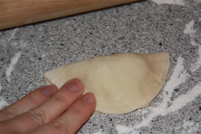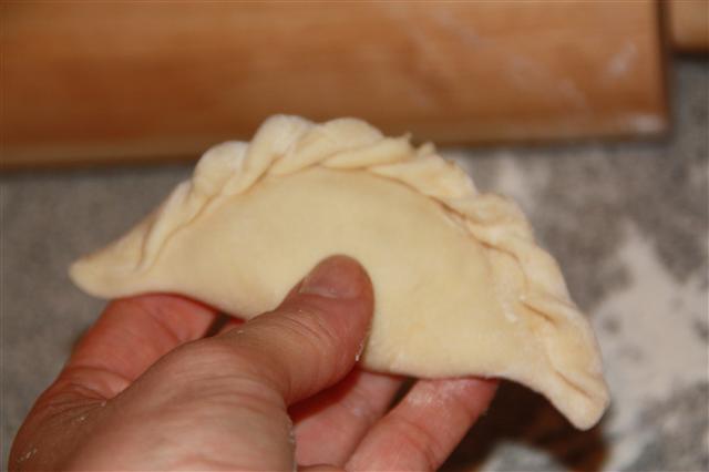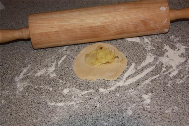 4. Teig portionsweise zu kleinen Fladen (etwa 8cm Durchmesser) ausrollen, jeweils 1 EL Kartoffelpüree darauf geben und die Fladen zur Hälfte überklappen. Leicht zusammendrücken und mit den Händen immer ein Stückchen Teig vom Rand zusammendrücken und wegziehen und dann umklappen und festdrücken. Das Ganze wiederholen bis der gesamte Rand verarbeitet ist.