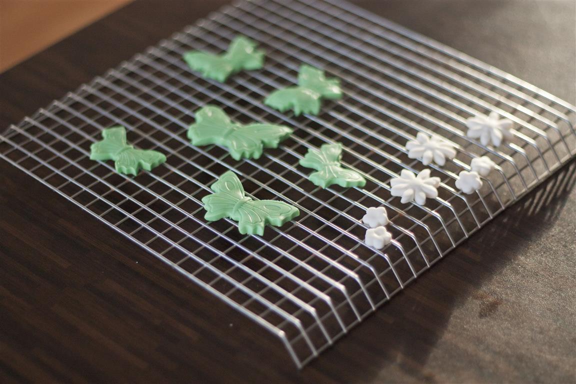 5. Biskuit auseinanderrollen und 3/4 der Erdbeercreme gleichmäßig darauf verstreichen. Wieder aufrollen und mit restlicher Creme bestreichen. Kleine Erdbeeren halbieren und auf Kuchen anbringen. Nach Geschmack mit Zuckerdeko verzieren, ich habe dafür kleine Blüten und Schmetterlinge aus Fondant ausgestochen.