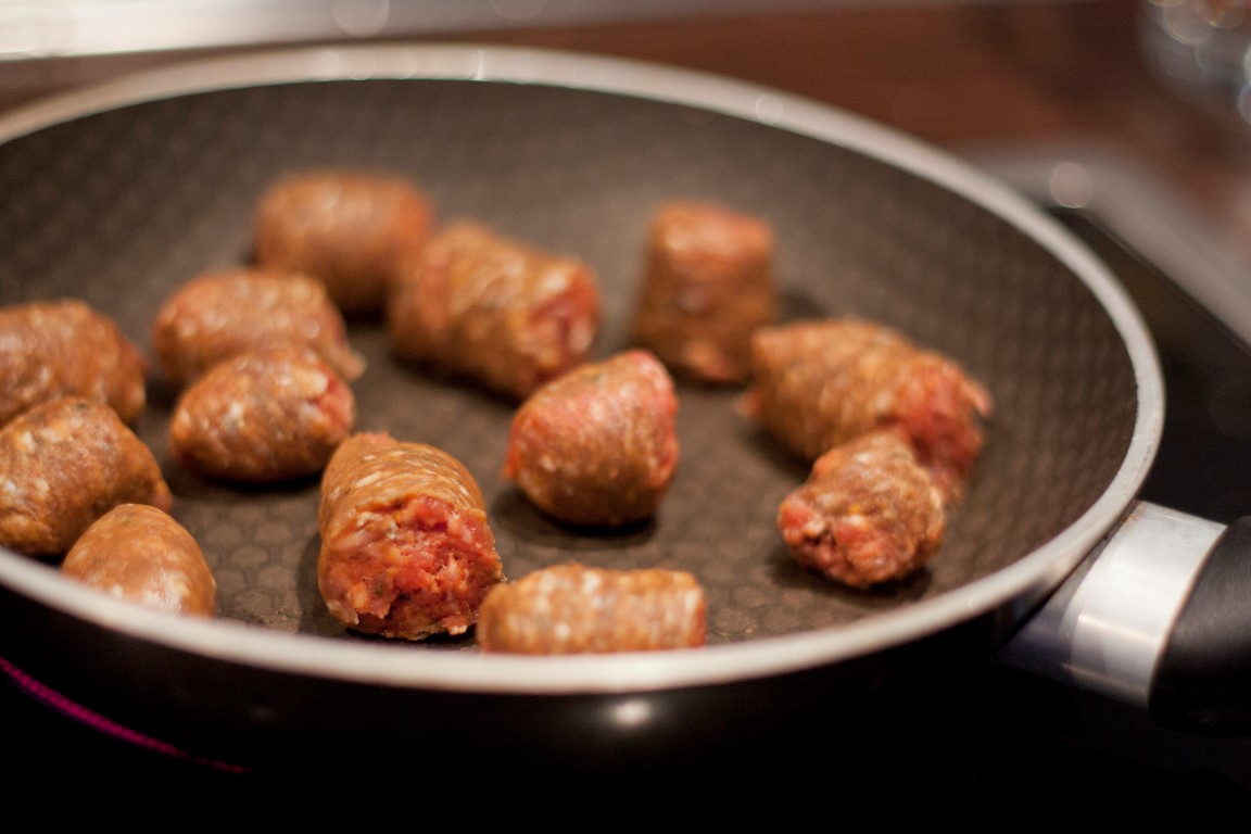 4. Merguez-Würstchen aufschneiden und Füllung aus Darm nehmen, zu kleinen Bällchen formen. In einer Pfanne anbraten. Topf mit Kürbis vom Herd nehmen, Ricotta einrühren und mit Pürierstab alles zu einer cremigen Suppe pürieren.