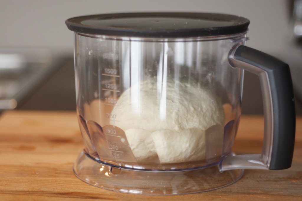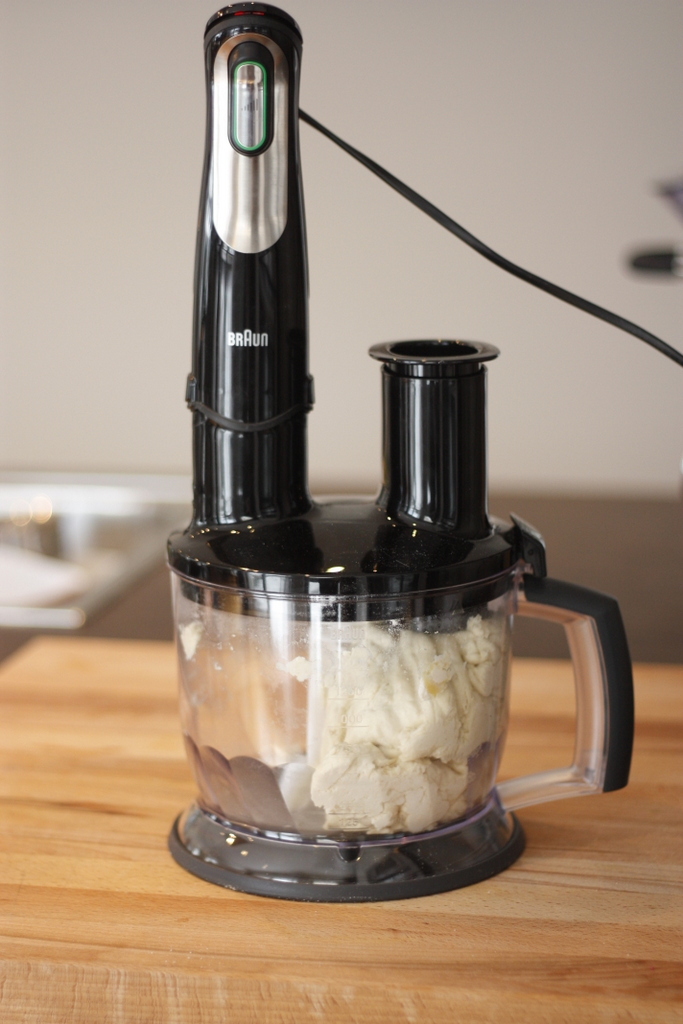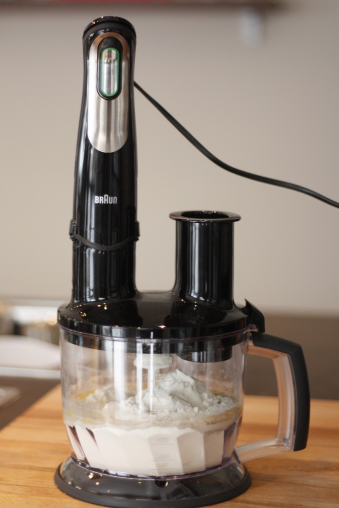 1. Mehl mit Hefe, Salz, Olivenöl und 150 ml Wasser verkneten. Nach und nach Wasser hinzugeben bis ein fester aber nicht klebriger Teig entstanden ist. Ich habe hierfür meinen neuen Aufsatz für den Pürierstab, den „Mutiquick EasyClick“ verwendet, was wunderbar funktioniert hat (siehe Fotos).