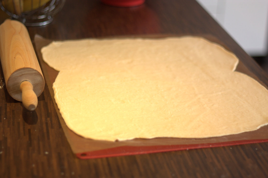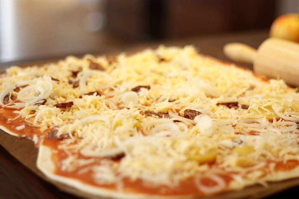 3. Eine Stunde vor der Zubereitung den Teig aus dem Kühlschrank nehmen und wieder ein bisschen gehen lassen. Jetzt mit etwas Mehl ausrollen und auf einem Blech mit Backpapier nach Lust und Laune belegen (ich habe für meine Variante eine Tomatensoße aus 300 ml passierten Tomaten, 4 EL saurer Sahne, Salz und Oregano angerührt und mit Salami, Käse und Zwiebeln belegt).