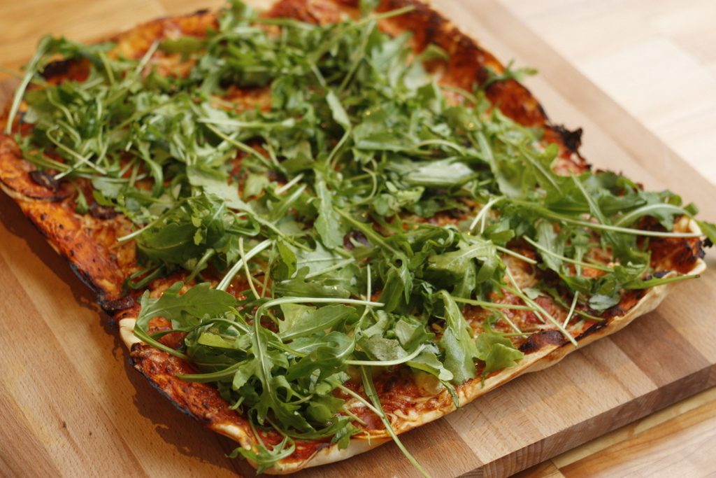 4. Im vorgeheizten Ofen bei 220°C (idealerweise Pizzastufe, also von unten die Hitze kommen lassen) ca 15 Minuten backen. Anschließend ggf. die kalten Zutaten darauf geben (in meinem Fall Rucola).