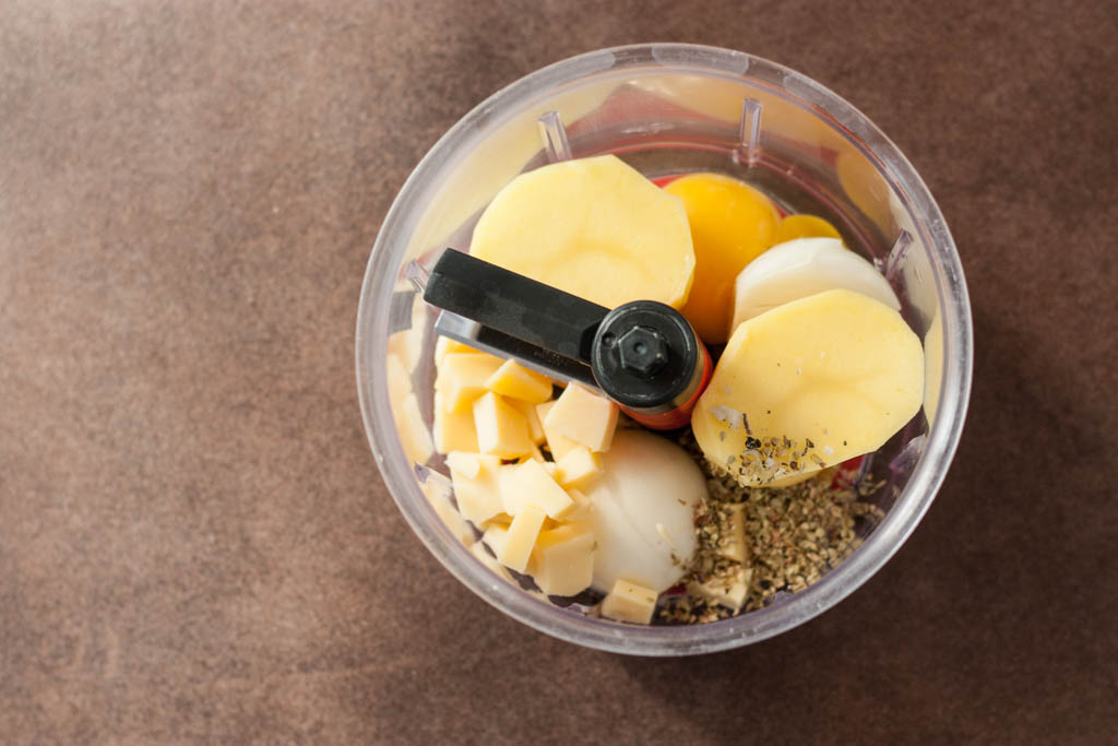 1. Zwiebel und Kartoffel schälen und halbieren. Mit Käse, Ei und Salz und Pfeffer in den Häcksler geben und klein häckseln.
