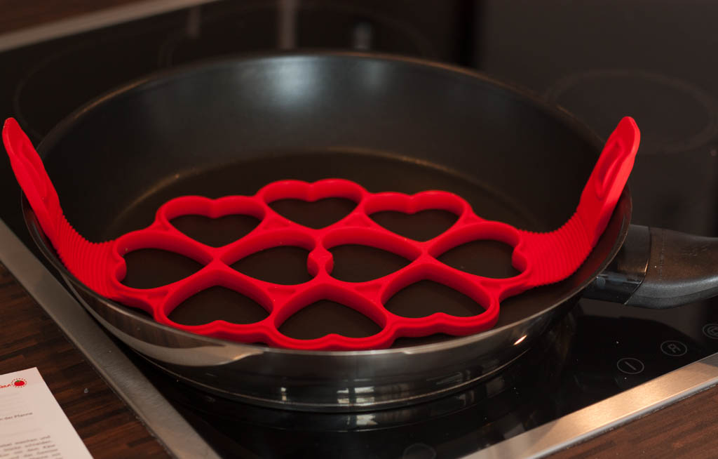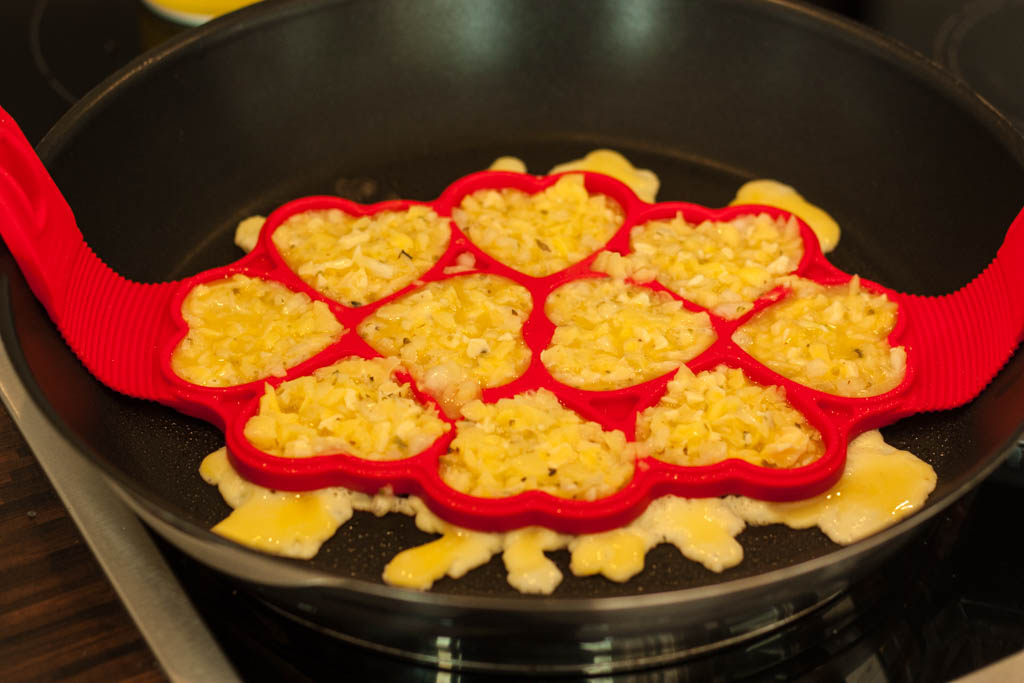 2. In einer Pfanne Öl erhitzen und entweder spezielle Silikonform (meine ist von Silikomart) oder Herz-Ausstechförmchen hineinlegen. Je 1 EL Eier-Masse in die Formen geben und brutzeln lassen bis die eine Seite leicht braun wird (ca. 3 Minuten). Nun die Form/Förmchen umdrehen und auch die andere Seite anbraten.