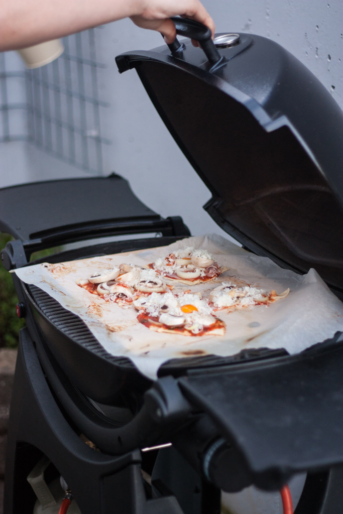 4. Mit etwas Mehl ausrollen und auf einem Blech mit Backpapier nach Lust und Laune belegen. Die Pizza in Stücke schneiden, so gart sie besser durch und lässt sich leichter auf den Grill legen.