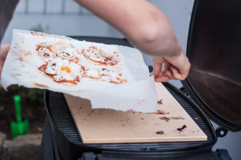 5. Nun den Grill auf 200 °C indirekt vorheizen und den Pizzastein auf dem Rost aufheizen. Man kann anschließend die Pizza direkt auf den Steig geben (eventuell mit Maisstärke bestäuben) oder mit etwas Backpapier auf den Stein legen, so klebt garantiert nichts fest.
