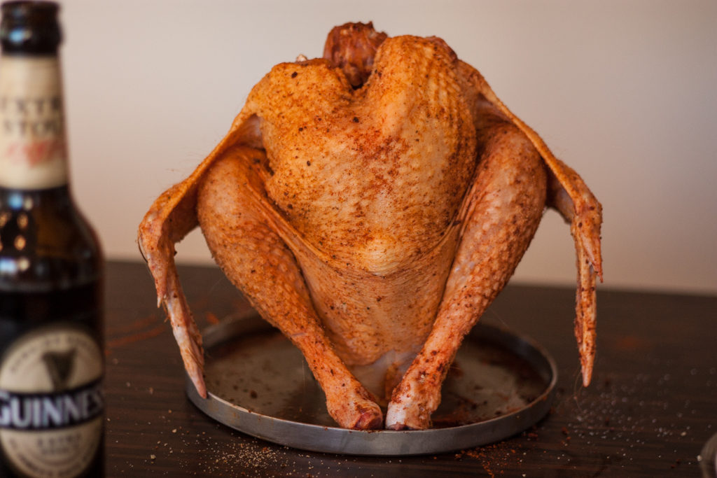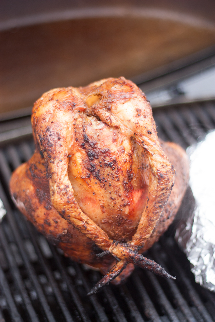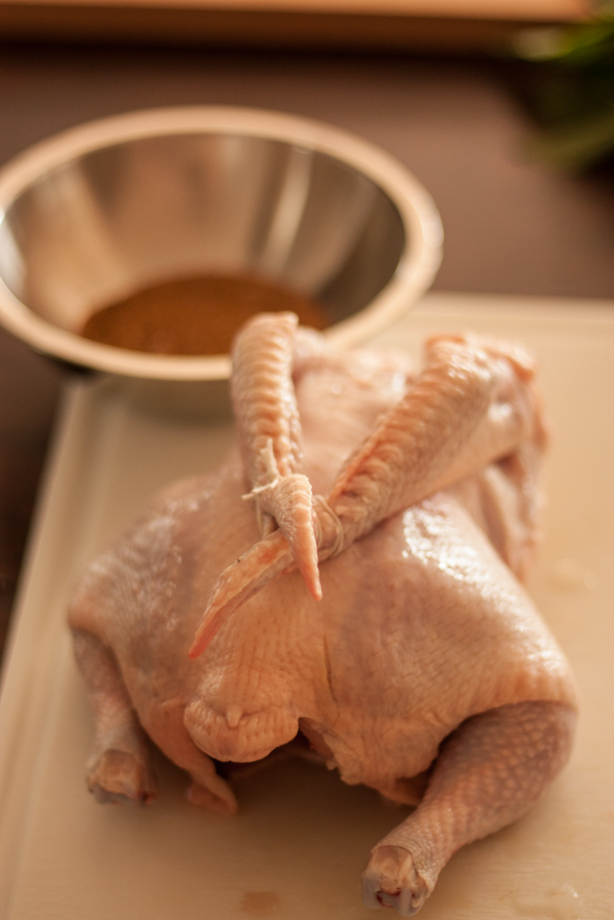 2. Alle restlichen Gewürze in einer Schüssel vermengen. Das Hähnchen unter fließendem Wasser waschen und mit Küchenkrepp trocken tupfen. Flügelspitzen auf den Rücken drehen und ggf. mit Küchengarn festbinden. Jetzt mit der Würzmischung von außen und innen einreiben und 30 Minuten lang Zimmertemperatur annehmen lassen. Grill auf mittlere indirekte Hitze vorbereiten.