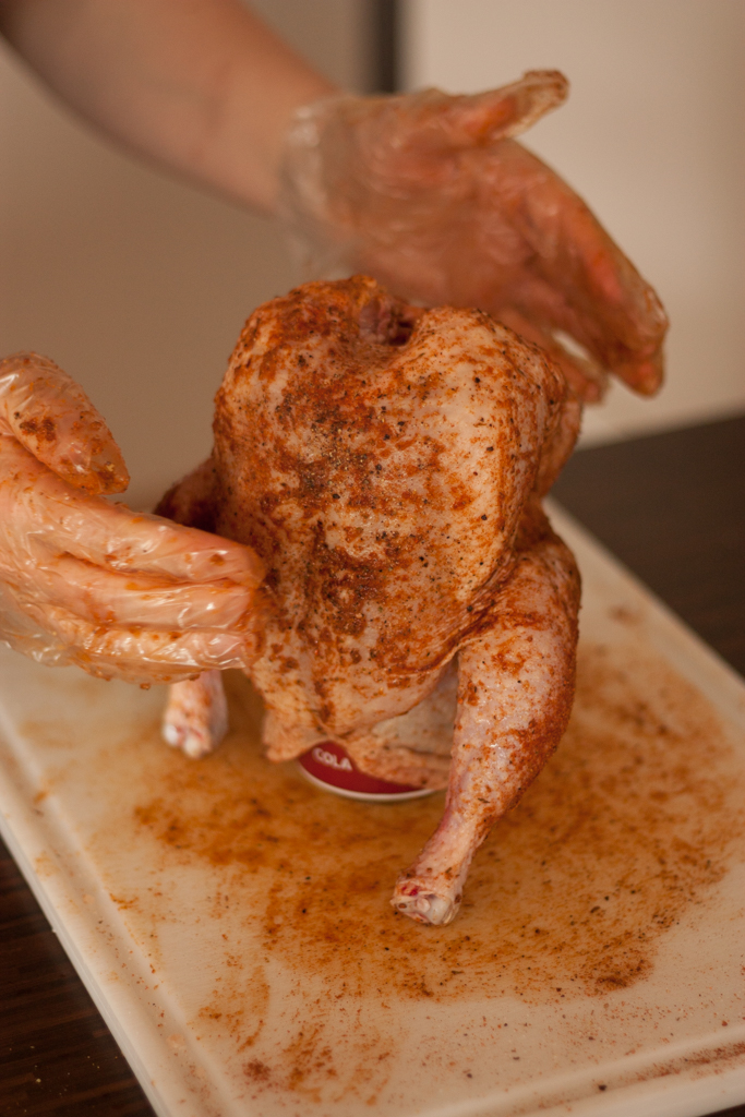 3. Bierdose öffnen und die Hälfte des Biers abgießen (*räusper* trinken! *räusper*). Mit Dosenöffner in den Deckel zusätzliche Löcher stanzen. Dose auf feste Unterlage stellen und das Hähnchen mit der Bauchhöhle über die Dose stülpen.