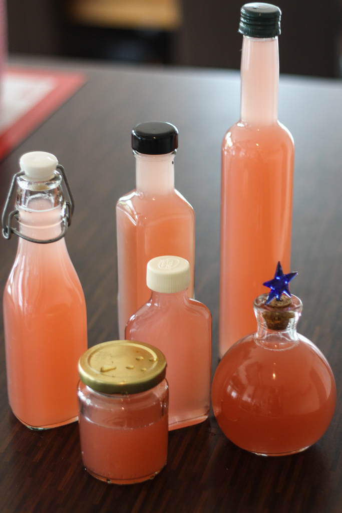 4. Sirup in ausgekochte Flaschen füllen und kühl lagern. Hält sich so mindestens 6 Monate und ergibt mit Mineralwasser gemischt (und ggf. etwas Eis und Minze) eine himmlische Rhabarberschorle.