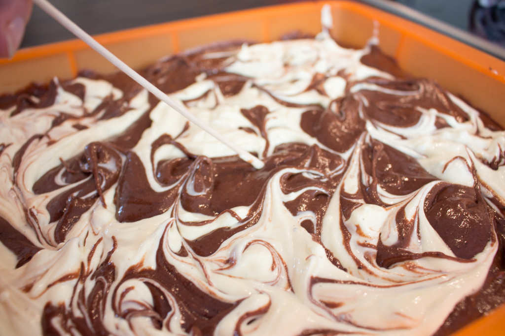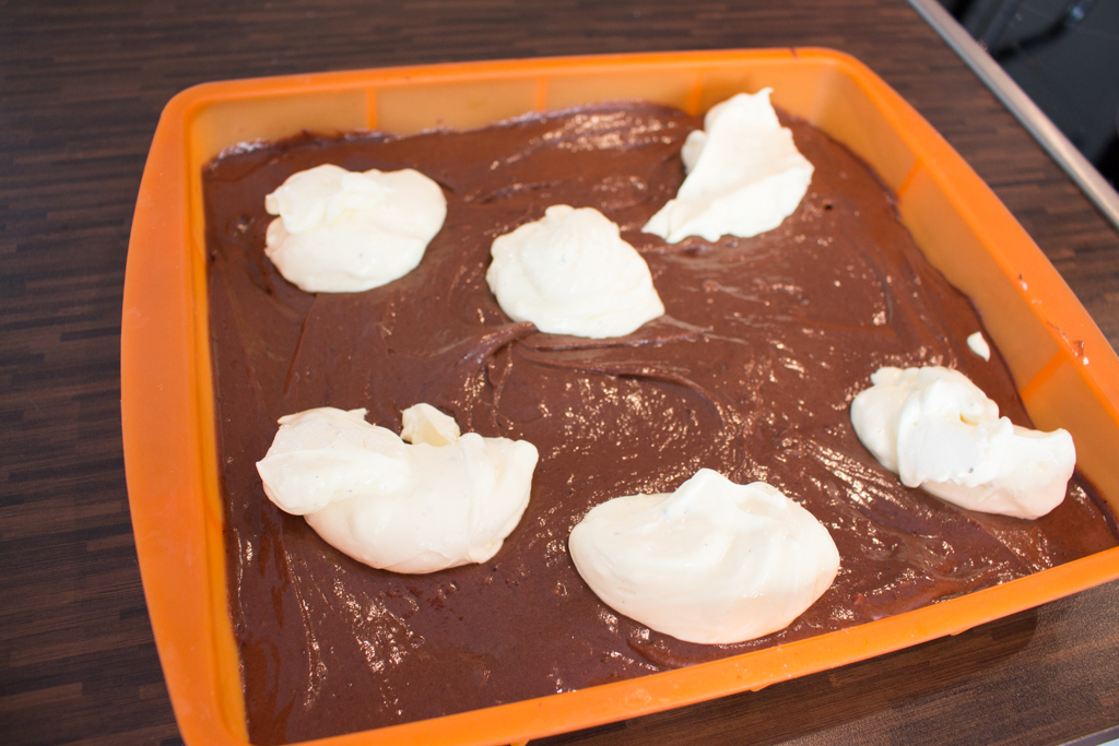 2. Mascarpone mit Eigelb, Zucker und Vanille verrühren. Mit einem Esslöffel Kleckse auf den Schokoteig geben und mit einem Zahnstocher ein Muster hineinziehen, damit kleine Schnörkel entstehen. 45-55 Minuten bei 180°C im Ofen backen bis der Teig gar, aber noch saftig ist. Auf einem Kuchengitter kühlen lassen, dann aus der Form lösen.