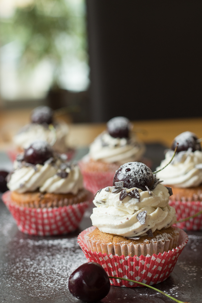 3. Sahne mit Vanille und Zucker steif schlagen. Mascarpone cremig rühren und mit Schokoraspel vermischen. Sahne unterheben und die Creme mit einer Sahnetülle dekorativ auf die Cupcakes spritzen. Mit Kirsche und Schokostreuseln dekorieren, mit Puderzucker bestreuen.