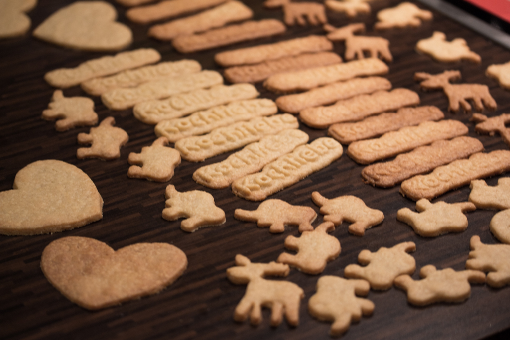 3. Teig kurz verkneten und auf bemehlter Arbeitsfläche 4 mm dick ausrollen. Mit Ausstechern verschiedene Plätzchen ausstechen und mit Abstand auf das Blech legen. Zum Ausstechen nehme ich gerne verschiedene Formen – diesmal Herzen, Elche*, Elefanten und sogar einen Kochliebe-Ausstecher*!