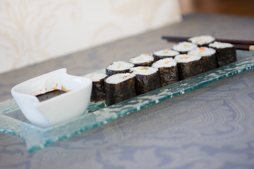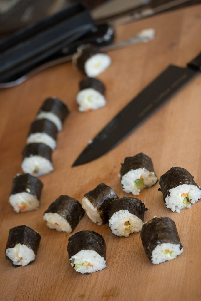 Geschmack: Man könnte auch noch rohen Lachs in die Makis füllen, aber der fehlt mir geschmacklich nicht wirklich. Den typischen Sushi-Geschmack bekommen die Röllchen durch die Noriblätter und den aromatisierten Reis. Dazu viel eingelegten Ingwer und Soja-Sauce (Ich gestehe: Wasabi ist mir zu scharf) und perfekt ist der Sushi-Spaß! Dazu kommt noch, dass diese Variante komplett vegan ist.
