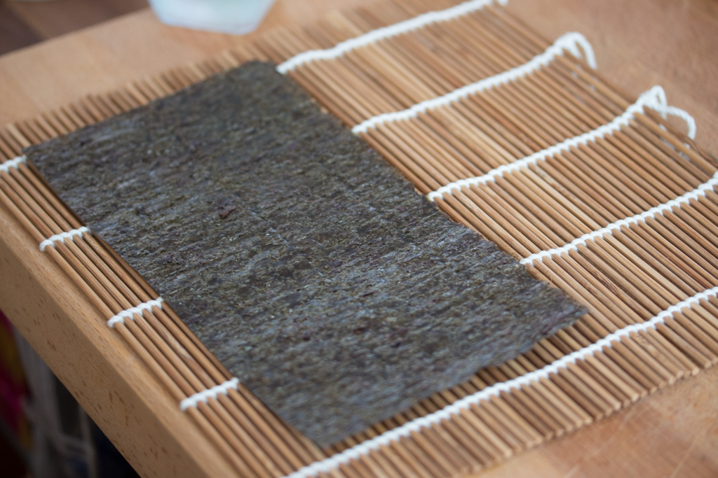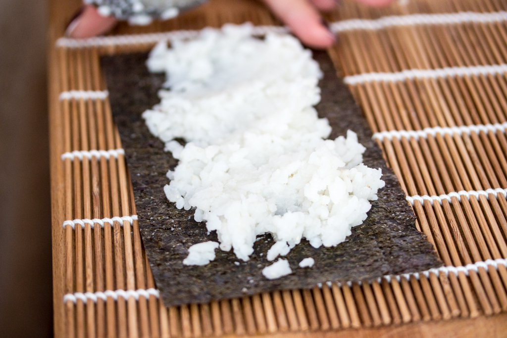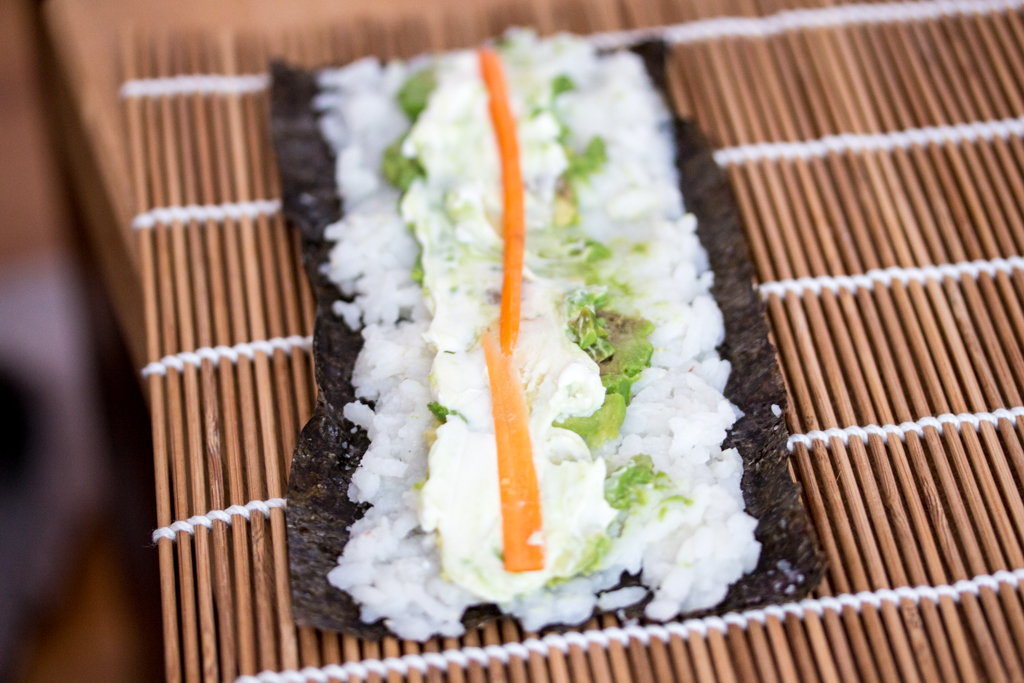 2. Eine Sushi-Matte mit einem halben Noriblatt belegen und mit Reis bestreichen. Dabei einen Zentimeter am oberen Rand freilassen (siehe Foto). Auf dem Reis die gewünschte Füllung verstreichen, z.B. eine Schicht Frischkäse, eine Avocado, ein dünner Streifen Karotte und ein dünner Streifen Gurke.