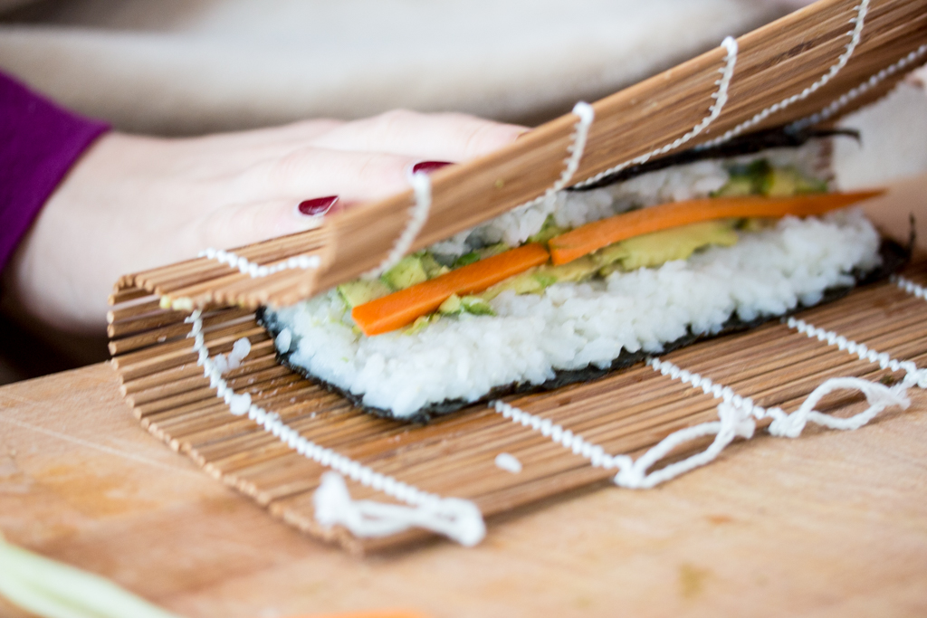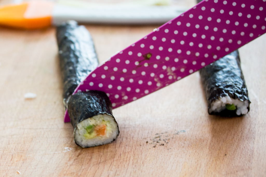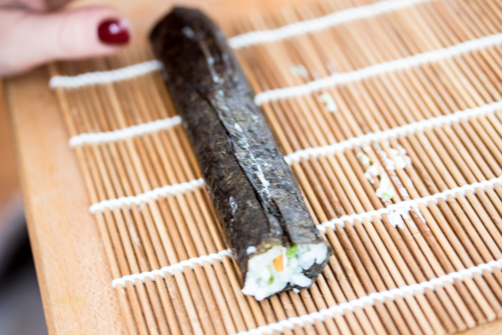 3. Mit Hilfe der Matte das Noriblatt aufrollen und fest drücken. Etwas Reisessig am Rand des Blatts verstreichen und somit die Sushi-Rolle verschließen. Etwas ziehen lassen und dann mit einem großen scharfen Messer die Rolle in ca. 3 cm dicke Sushis schneiden.