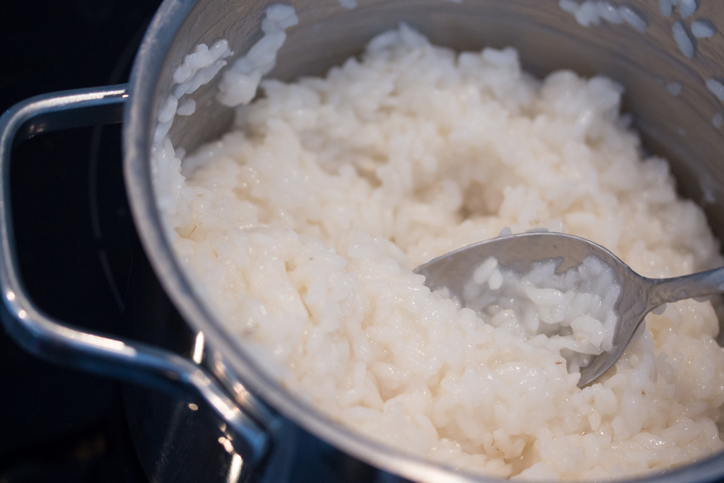 1. Den Reis mit kaltem Wasser waschen bis das Wasser klar ist und abtropfen lassen. Mit 280 ml Wasser und Salz in einen Topf geben und kochen bis der Reis weich ist (ca. 20 Minuten), dabei immer wieder umrühren. Den Reis auf Raumtemperatur abkühlen lassen und Reis-Essig unterrühren.