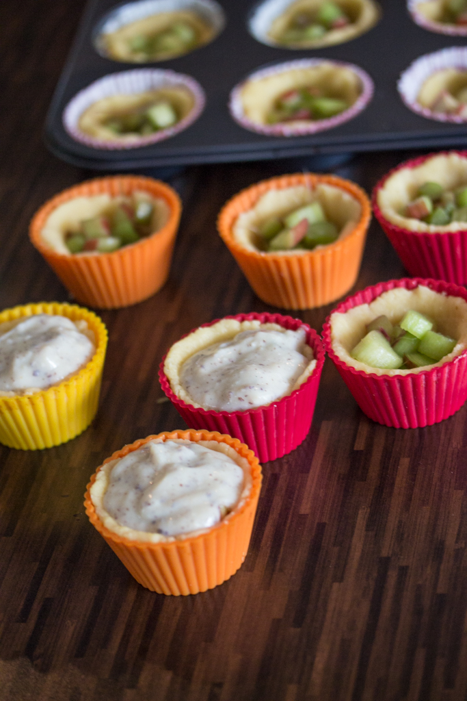 5. Rhabarber abtropfen lassen und auf die Muffinförmchen verteilen. Vanilleguß darauf geben und nochmal 20 Minuten backen lassen.
