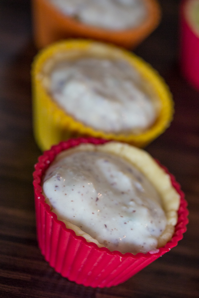 4. Backofen auf 180° vorheizen. Teig in 18 Teile aufteilen und zu kleinen Kugeln rollen. Diese etwas platt auswellen und in Muffinförmchen am Rand hochziehen. Im Muffinblech 10 Minuten vorbacken.