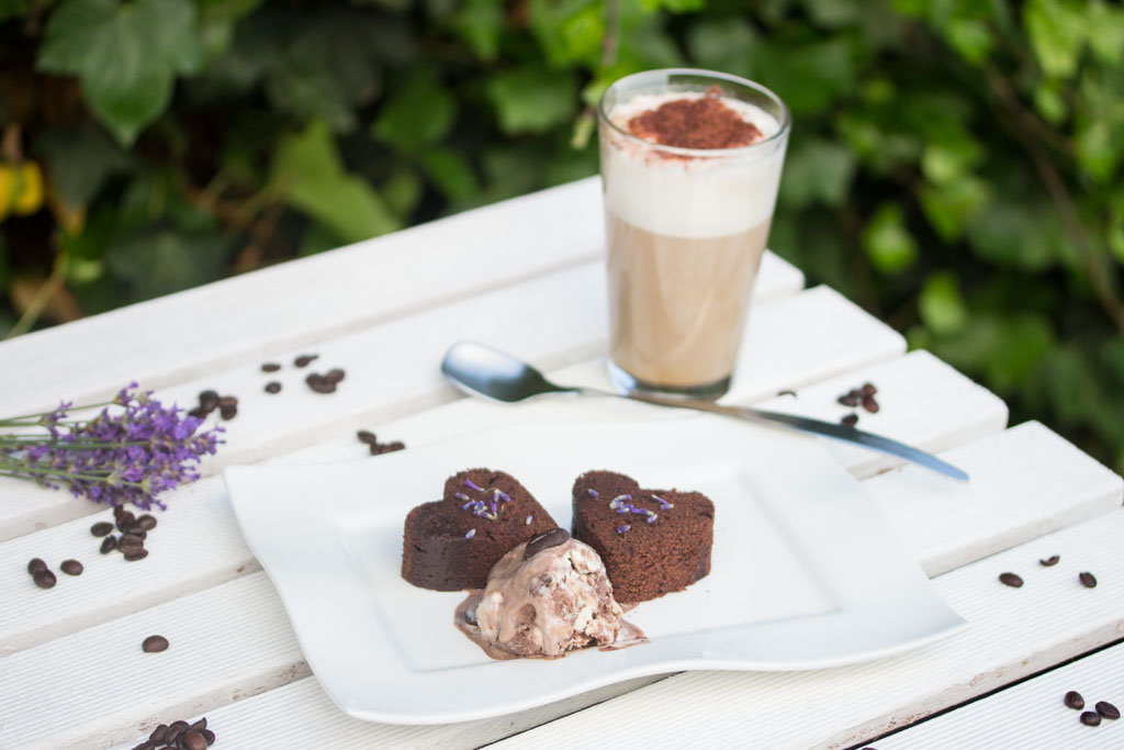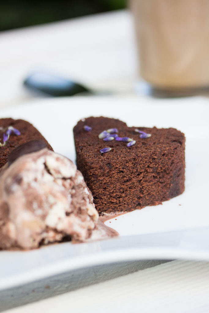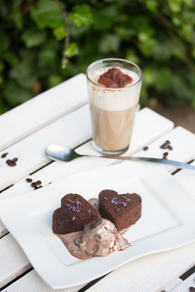 Geschmack: Mund auf – Glück rein! Dieser warme Kuchen sollte unbedingt in Verbindung mit einem schönen cremigen Eis gegessen werden. Er ist schön fluffig und schokoladig und saugt perfekt das schmelzende Eis auf. Weil meine Mum Lavendel so gerne mag, habe ich eine Lavendelblüte über jedem Herz verstreut. Das blumige passt meiner Meinung nach geschmacklich sehr gut zum satten Geschmack des dunklen Schokoladenkuchens, aber wem das zu exotisch ist, lässt dies einfach weg.