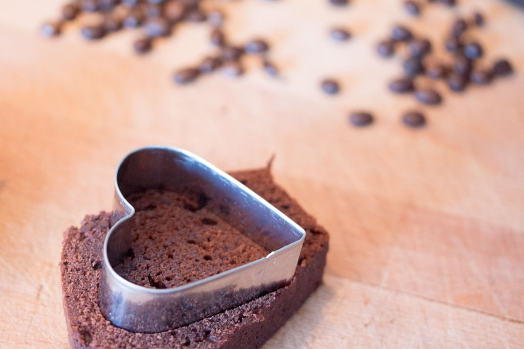- Den Kuchen in dicke Scheiben schneiden und daraus Herzchen ausstechen (die Kuchenreste am besten zerkrümeln und für Schichtdesserts oder Cake Pops verwenden).