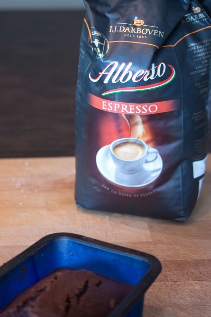 - Espressobohnen mit einem Messer grob hacken. Die Bohnen mit Kakao und Eiern unter die Buttermasse rühren. Zucker, Vanille, Salz, Mehl und Backpulver vermischen und unter den Teig rühren. In einer gefetteten Kastenform bei 180°C 40 Minuten backen und anschließend auskühlen lassen.