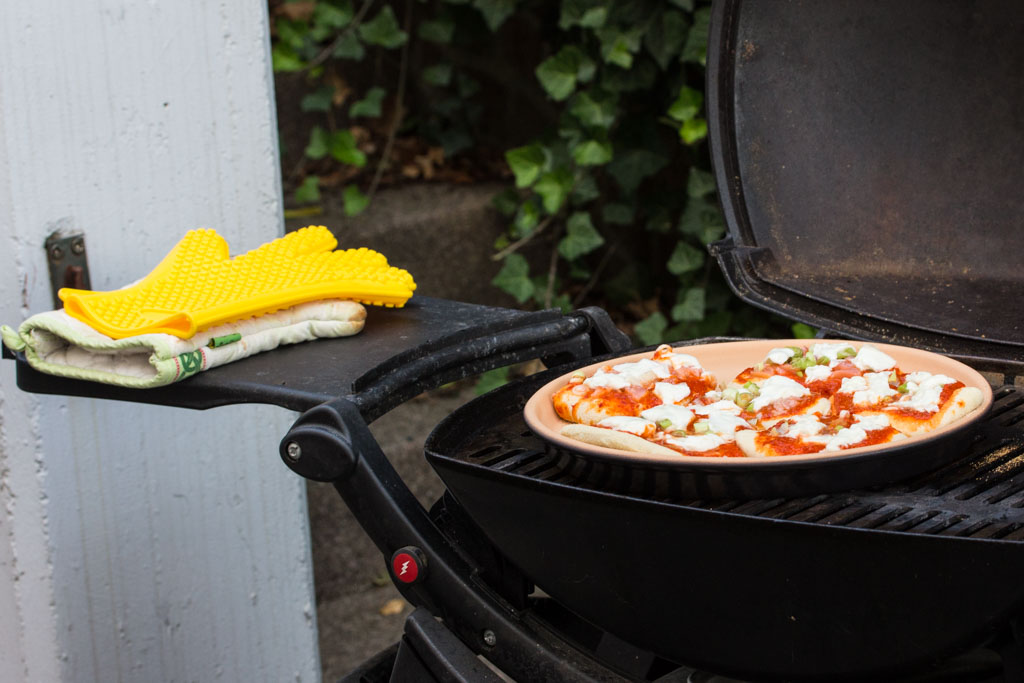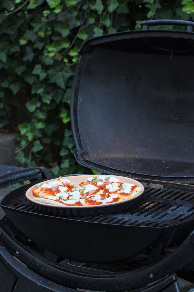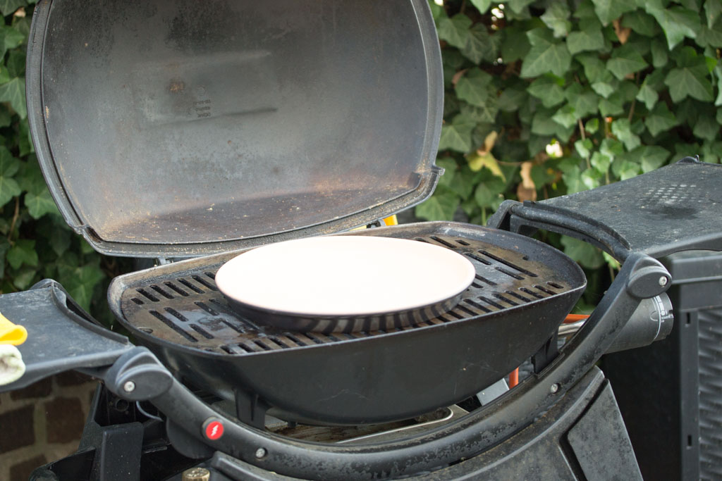 - Bevor du die Pizza belegst, kannst du schon mal den Backstein auf den Grill legen, diesen auf voller Hitze einheizen und den Deckel schließen.