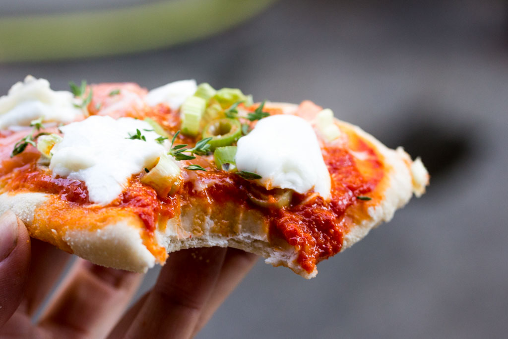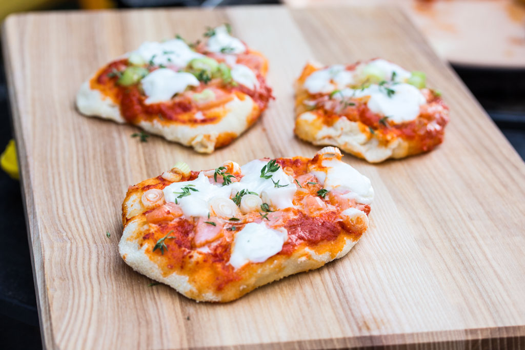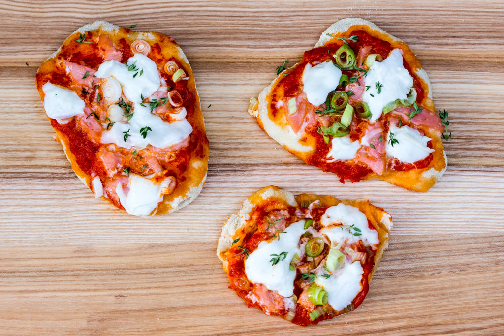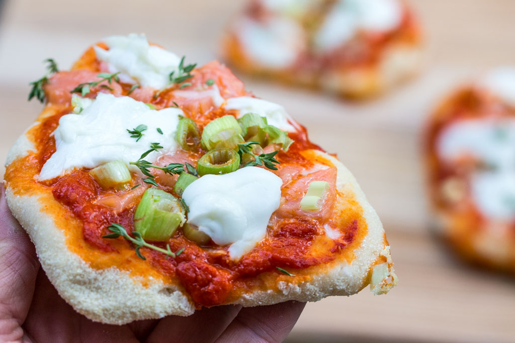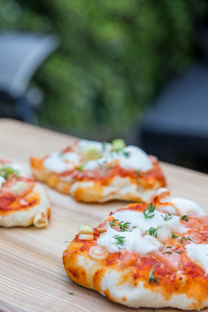Geschmack: Ich freu mich! Immer wenn eine etwas mutige Geschmackskombination funktioniert, bin ich besonders glücklich. So wie hier: Der scharf-würzige Ajvar funktioniert richtig gut mit dem Räucherlachs, den Frühlingszwiebeln und dem cremigen Mozzarella. Da mein Schatz keinen Fisch mag, hab ich auf seinen Teiglingen den Lachs weggelassen – geht auch!