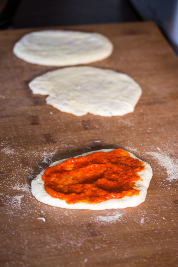 - Teig in 6 kleine Kugeln zerteilen und mit dem Nudelholz zu dünnen Fladen ausrollen. Den Tisch mit Hartweizengrieß bestäuben, so klebt nichts. Die müssen nicht perfekt rund sein, im Gegenteil, das Ungleichmäßige sieht bei Dinette recht hübsch aus. Direkt mit Ajvar bestreichen und mit zerzupftem Räucherlachs und in feine Ringe geschnittenen Frühlingszwiebeln belegen. Zum Schluss noch Büffelmozzarella in Stücken darübergeben und auf ein mit Hartweizengrieß bestäubtes Brett legen. Kurz gehen lassen.
