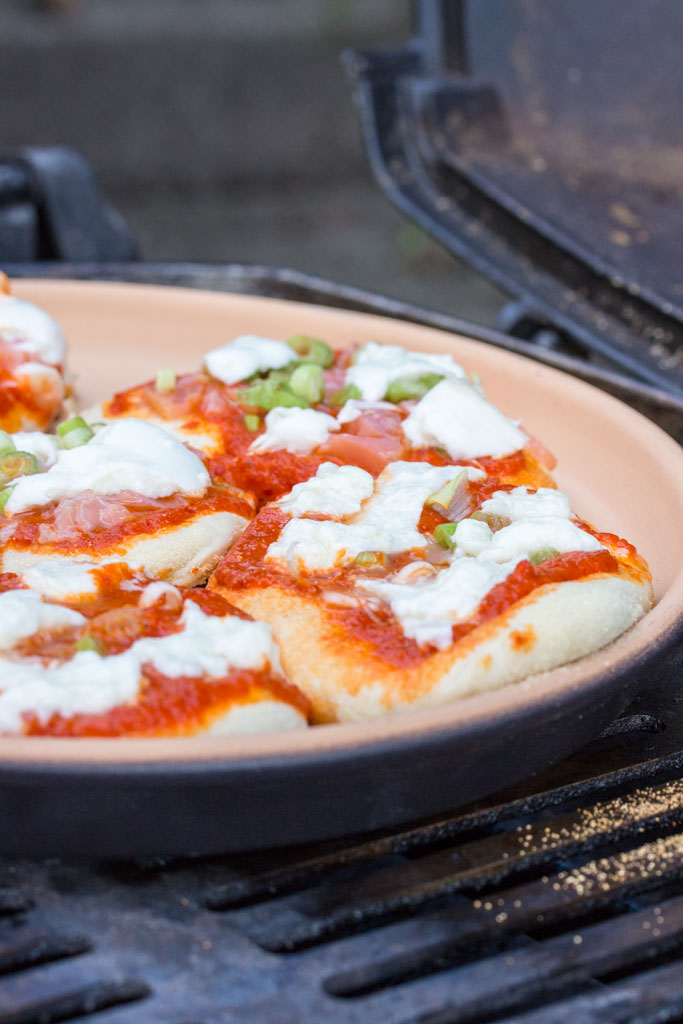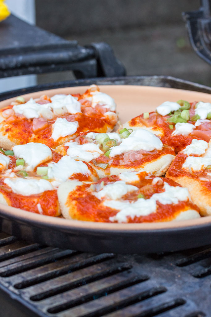Den Anfang von „Anders Grillen“ macht der viel gelobte Pizza-Stein. Ich habe den Backstein von Römertopf* ausprobiert und damit eine Ajvar-Lachs-Dinette gegrillt. Diese schwäbischen Minipizzen sind als Vorspeise ein toller Auftakt für jeden Grillabend oder sättigen als Hauptgericht an der Seite von Salat auch an heißen Sommertagen.